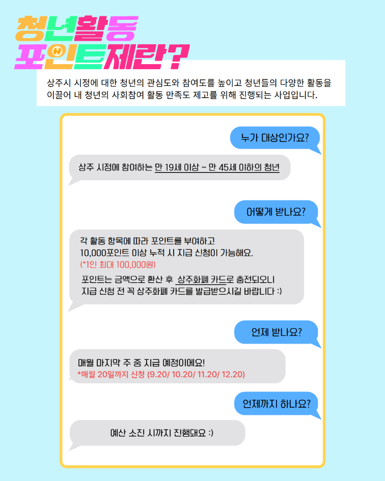 ◦ 사업대상: 상주 시정에 참여하는 만 19세 이상 만 45세 이하의 청년