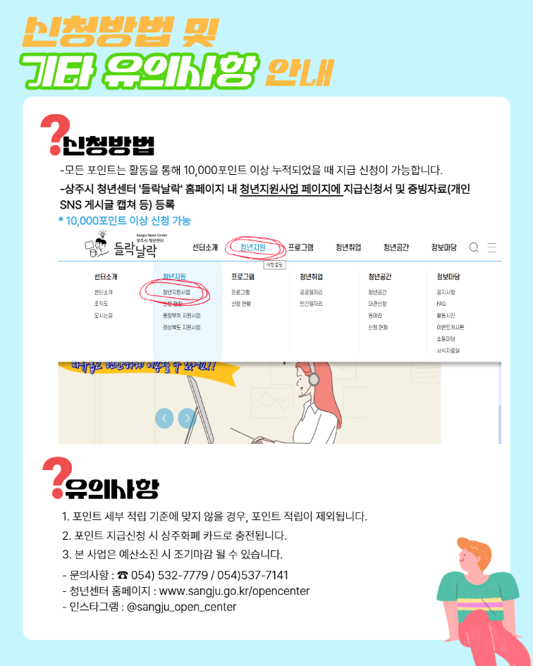 - 상주시 청년센터 홈페이지 '들락날락' 청년지원사업 페이지에 증빙자료와 함께 지급 신청서 등록