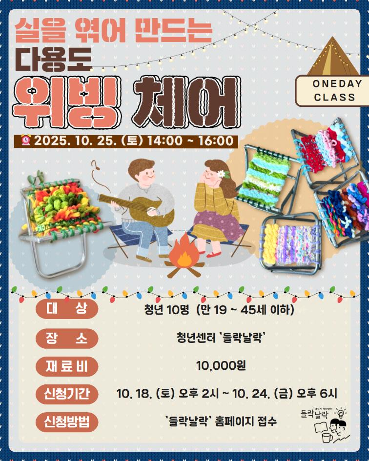 실을 엮어 만드는 다용도 위빙 체어 원데이클래스에 참여하실 청년분들을 모집합니다.