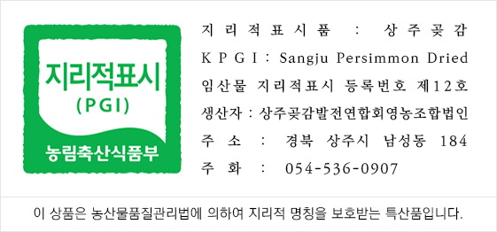 - It is marked in a prominent position with an easy-to-identify size and beautiful color on the front or side of the package to actively promote Sangju dried persimmons registered as geographical indication products and to differentiate them from other dried persimmons.